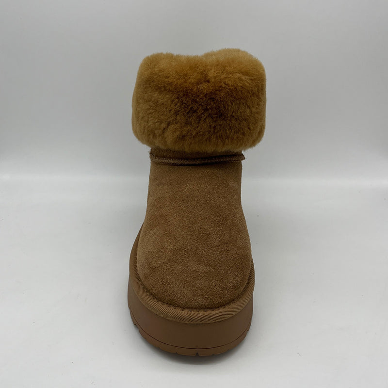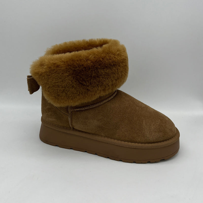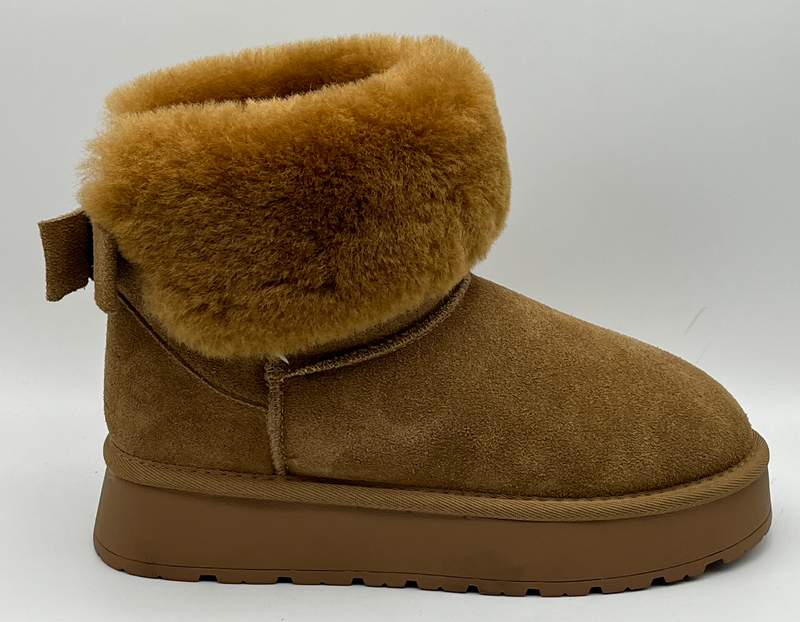 Besondere Qualitätsmerkmale – echtes Lammfell – Robuste Schurwolle als Decksohle und Futter – Suede Leder Obermaterial – PU Plateau Sohle